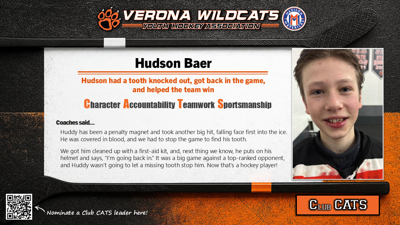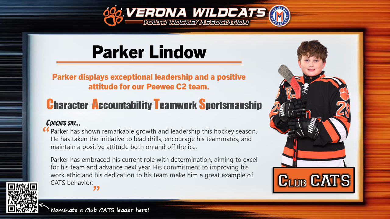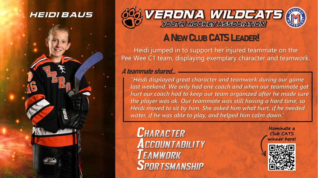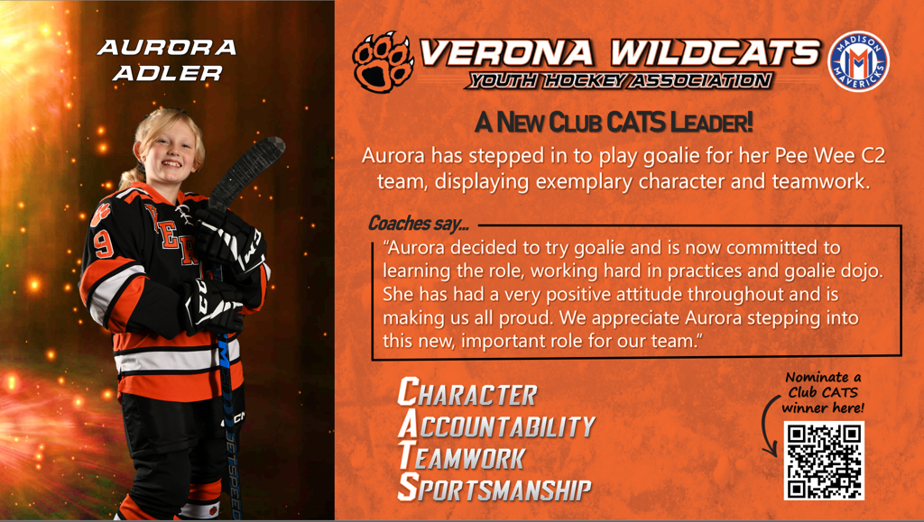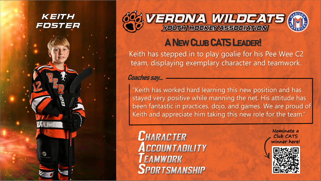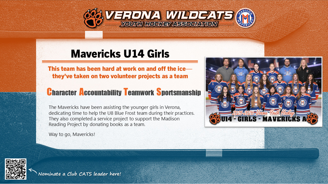 The Club CATS award recognizes players, parents, and coaches who lead the way in demonstrating character, accountability, teamwork, and sportsmanship. This award celebrates the best behaviors in Verona Youth and Madison Mavericks hockey. See someone showing CATS culture at its best? Nominate them here so we can celebrate them!