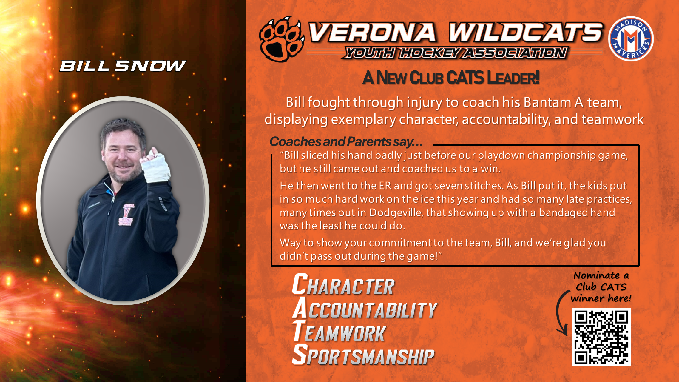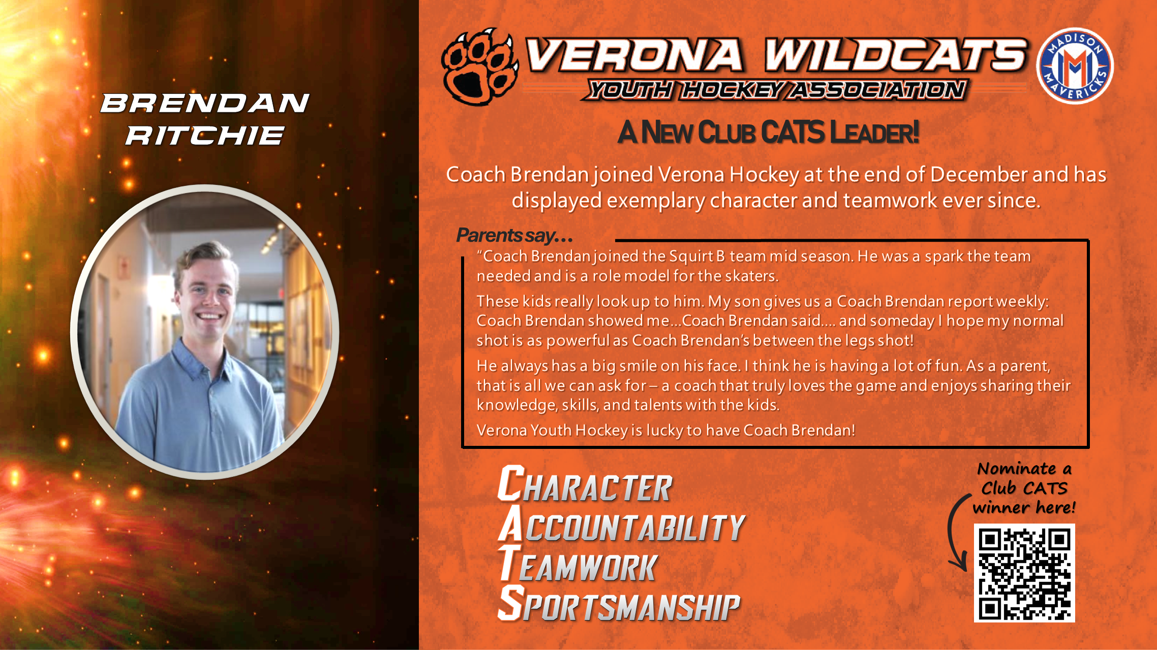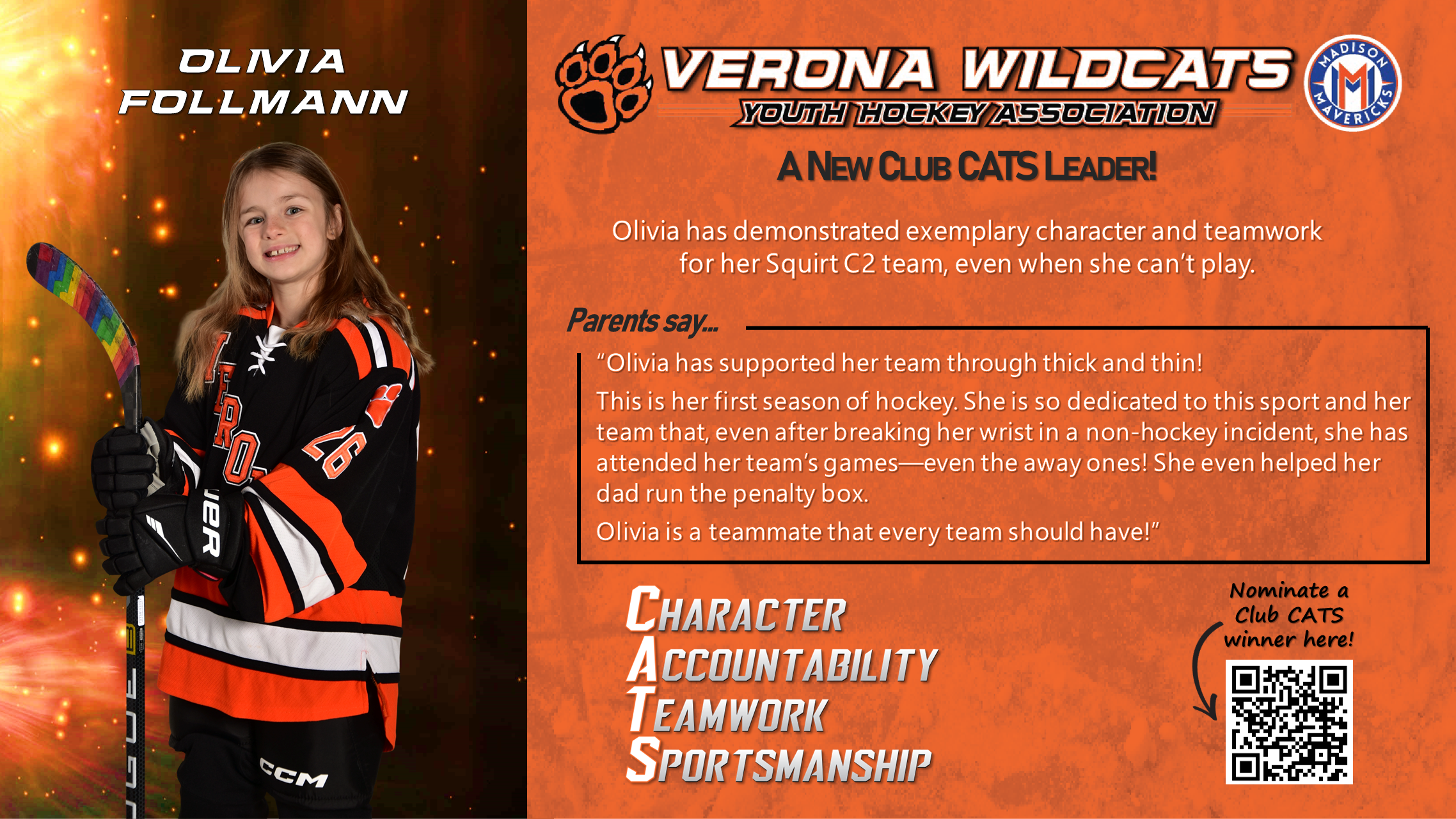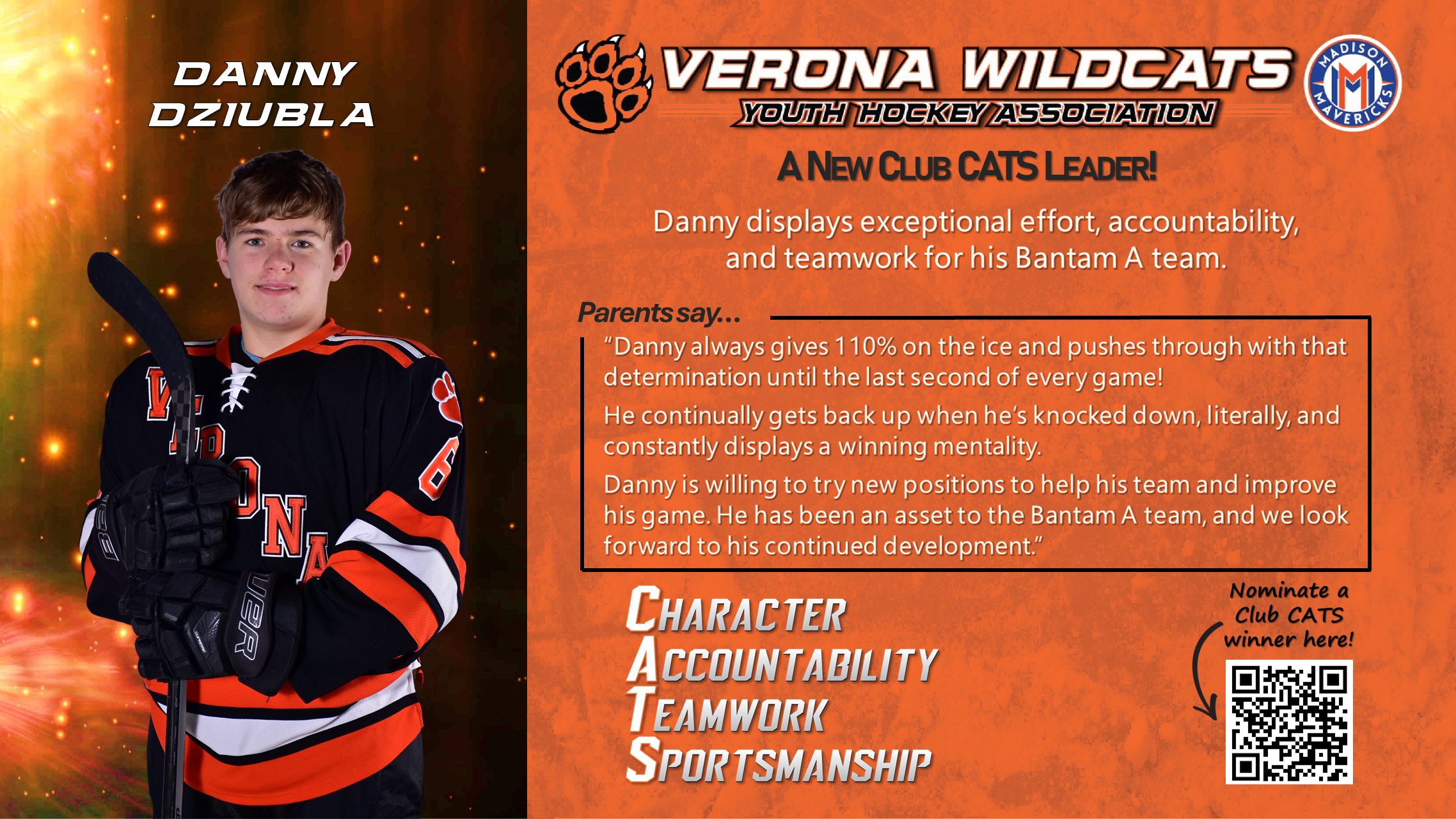 The Club CATS award recognizes players, parents, and coaches who lead the way in demonstrating character, accountability, teamwork, and sportsmanship. This award celebrates the best behaviors in Verona Youth and Madison Mavericks hockey. See someone showing CATS culture at its best? Nominate them here so we can celebrate them!